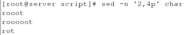[root@server script]# sed -n '2,4p' char ##打印2~4行,包括第2行与第4行