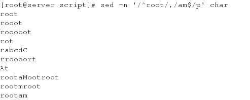 [root@server script]# sed -n '/^root/,/am$/p' char ##打印以"root"为行首的行到以"am"为行尾的行