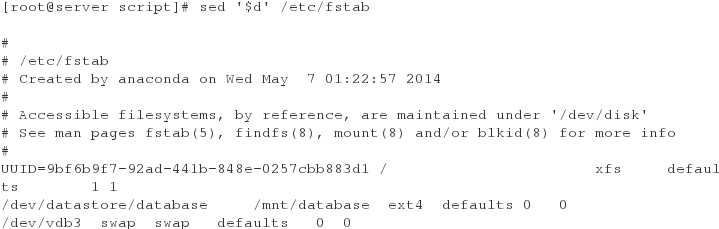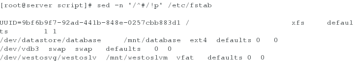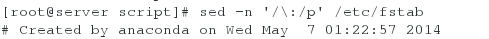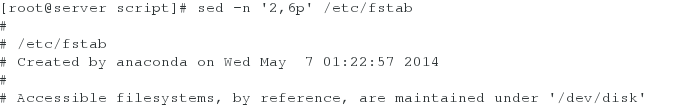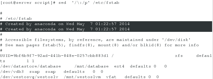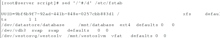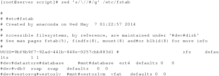 [root@server script]# sed -e '1,3d' -e 's///#/g' /etc/fstab