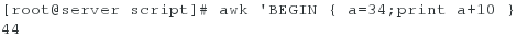 [root@server script]# awk 'BEGIN { a=34;print a+10 }' ##只有BEGIN代码块时,命令依然可以执行