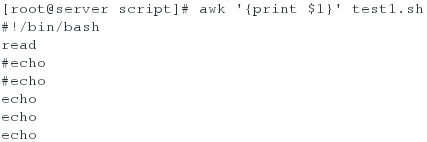 [root@server script]# awk '{print $1}' test1.sh ##以空格文分隔符,输出每行的第一个字段