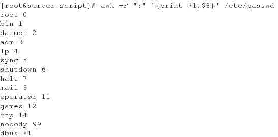 [root@server script]# awk -F ":" '{print $1,$3}' /etc/passwd ##指定":"为分隔符,输出每行的第一个和第三个字段