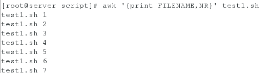 [root@server script]# awk '{print FILENAME,NR}' test1.sh ####输出文件名,和当前操作的行号
