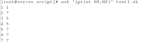 [root@server script]# awk '{print NR,NF}' test1.sh ####输出每次处理的行号,以及当前处理行以" "为分隔符的字段个数