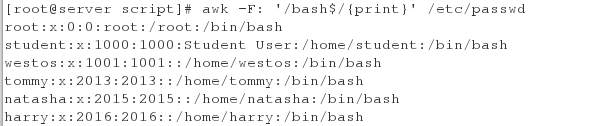 [root@server script]# awk -F: '/bash$/{print}' /etc/passwd ##输出以bash结尾的行