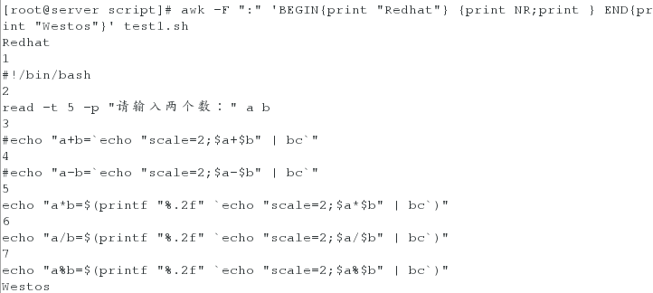 [root@server script]# awk -F ":" 'BEGIN{print "Redhat"} {print NR;print } END{print "Westos"}' test1.sh