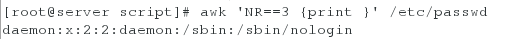 [root@server script]# awk 'NR==3 {print }' /etc/passwd ##输出第三行的内容