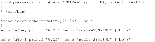 [root@server script]# awk 'NR%2==1 {print NR; print}' test1.sh ##输出奇数行行号以及内容