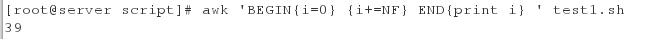 [root@server script]# awk 'BEGIN{i=0} {i+=NF} END{print i} ' test1.sh ##统计文本总字段数(默认以" "为字段分隔符)