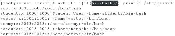 [root@server script]# awk -F: '{if($7~/bash$/) print}' /etc/passwd ##输出字段7匹配以bash结尾的行