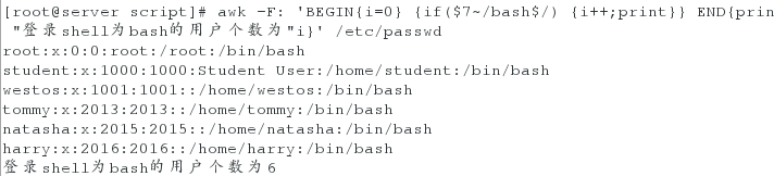 [root@server script]# awk -F: 'BEGIN{i=0} {if($7~/bash$/) {i++;print}} END{print "登录shell为bash的用户个数为"i}' /etc/passwd