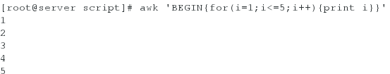 [root@server script]# awk 'BEGIN{for(i=1;i<=5;i++){print i}}'