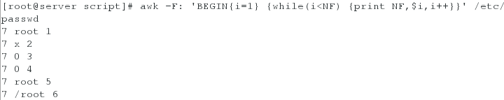 [root@server script]# awk -F: 'BEGIN{i=1} {while(i<NF) {print NF,$i,i++}}' /etc/passwd