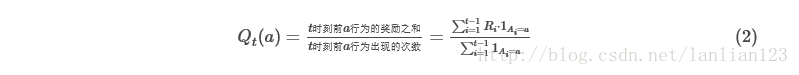对行为值的估计是为了更好的选择行为。行为的值为每次执行该行为所得奖励的期望。因此可以用t时刻前行为已得到的奖励作为行为值的估计,即: