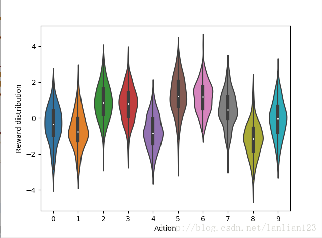 在每个赌博机问题中,动作值(action value)服从期望为0,方差为1的高斯分布。当一个具体的学习方法应用于在时间步t选择动作问题上时,实际奖赏Rt服从期望q*(At)方差1的正态分布。如图2.1所示,我们把这种实验称为十臂测试平台。