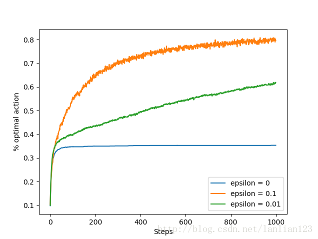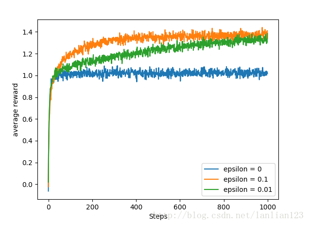 在以上数据的基础上,在十臂赌博机基础上考虑一下三种情况来做一个实验:贪心算法、ε-贪心算法(ε=0.1)和ε-贪心算法(ε-0.01)其结果如下: