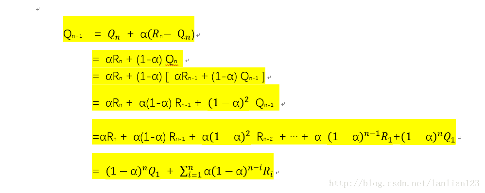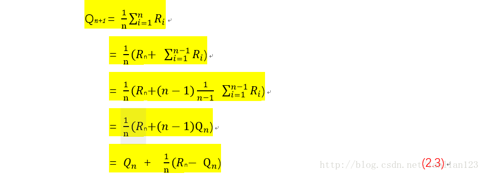 为了简化我们所关注的单个动作,我么用Ri表示第i个动作选择之后得到的奖赏值。用Qn表示选择n-1次的动作值。简化如下: