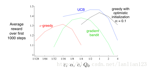 这张我们介绍了几种简单的平衡探索和利用的方法,ε-greedy方法以ε概率随机选择动作,UCB方法选择确定动作但同时UCB又巧妙地设计了在每一步倾向于选择那些收到样本更少的动作进行探索。梯度赌博算法估计的不是动作值,而是动作偏好,更加倾向于选择统一分级的动作,而其分布概率方法则采用了soft-max概率分布方法。乐观初始值方法比贪心算法更加显著的进行探索。但很多人会产生一个疑问:这些方法中那个方法最好。我们在此通过parameter study 图来给出解答: