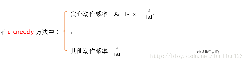 贪心算法:上式描述了贪心算法,即每次选择具有最大值的行为。这种方法具有一定的缺陷,即只有利用并不探索,在某种程度上来说,贪心算法可以得到立即奖赏最大值,但从长远角度来看,它并不一定能得到最大的奖赏总值。由此产生了ε-greedy方法:在大多数情况下选择贪婪动作,而在ε概率下从所有的动作中等概率选择(所有包括贪心动作也包括非贪心动作,或许有的资料上除去了贪心动作,但在笔者的参考资料上是所有的动作)。ε-greedy方法的一个优势在于它能在有限的时间内更行行为的估计值,已达到Qt(a)收敛于q∗(a)的效果。