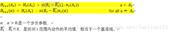 基于随机梯度上升的思想,有一个自然学习算法,在每一步中,选择动作之后会收到一个奖赏,通过如下函数更新动作偏好: