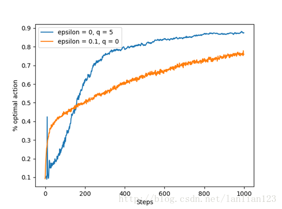 初始动作值也可以作为一个简单的鼓励探索方法。在下图中,优化方法在最开始的时候因为探索更多而表现的不是很好,但随着探索的减少最终它表现的更好。我们称这种鼓励探索的方法为优化初始值。但这种方式并不适用于不稳定问题。因为在不稳定情景中,情景(task)一旦变化,又会重新探索,优化初始值并不会所帮助。