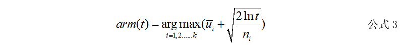 t表示t时刻或者t轮实验,arm(t)表示t时刻选择的手柄, ui均值表示手柄i在以前实验中的平均收益,ni表示手柄i在以前实验中被选中的次数。α是(0,1)为超参数,用以控制探索部分的影响程度。