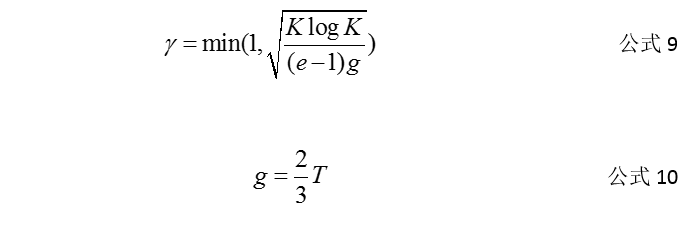 ϒ是一个超参数,值域为[0,1],可以采用固定值,在实验轮数确定的情况下,建议使用公式9来计算ϒ,其中K为臂的个数,T为实验的轮数。