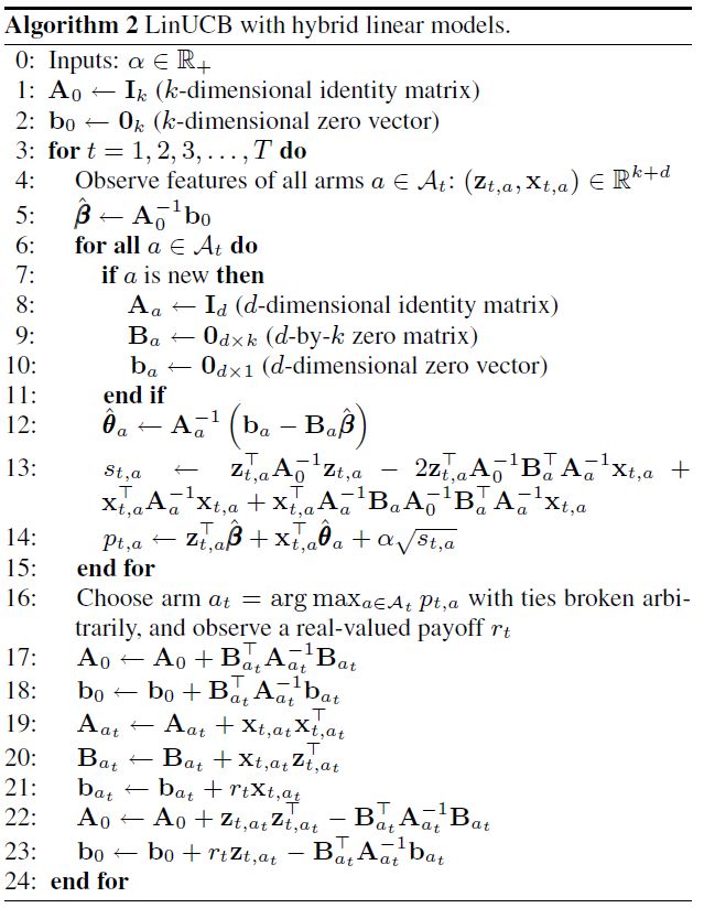 以上介绍的MAB算法都没有充分利用上下文信息,这里所说的上下文信息包括用户、物品以及其他相关环境相关的特征。而LinUCB算法是在UCB算法的基础上使用用户、物品以及其他相关环境相关的特征来进行UCB打分。LinUCB算法做了一个假设:一个Item被选择后推送给一个User,其回报和相关Feature成线性关系,这里的“相关Feature”就是上下文信息。于是预测过程就变成:用User和Item的特征预估回报及其置信区间,选择置信区间上界最大的Item推荐,然后依据实际回报来更新线性关系的参数。