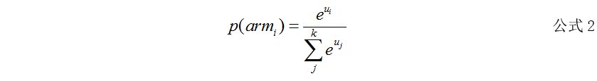 3. Softmax算法:该算法是在Epsilon-Greedy算法的基础上改进的,同样是先选择是Explore(探索)还是Exploit(原有)。对于Exploit阶段,与Epsilon-Greedy算法一致。对于Explore,并不是随机选择手柄,而是使用Softmax函数计算每一个手柄被选中的概率。armi表示手柄i,ui表示手柄i的平均收益,k是手柄总数。