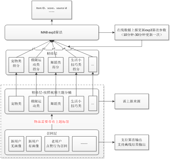 4. 神盾推荐在短视频推荐上应用Exp3的结构如下图所示,可以看到exp3被应用在ReRank层,每一个臂都可能被摇到,同时从数学角度保证整体选择的收益肯定远高于最坏情况,进而在保证多样性的同时,整体收益高于最坏收益。
