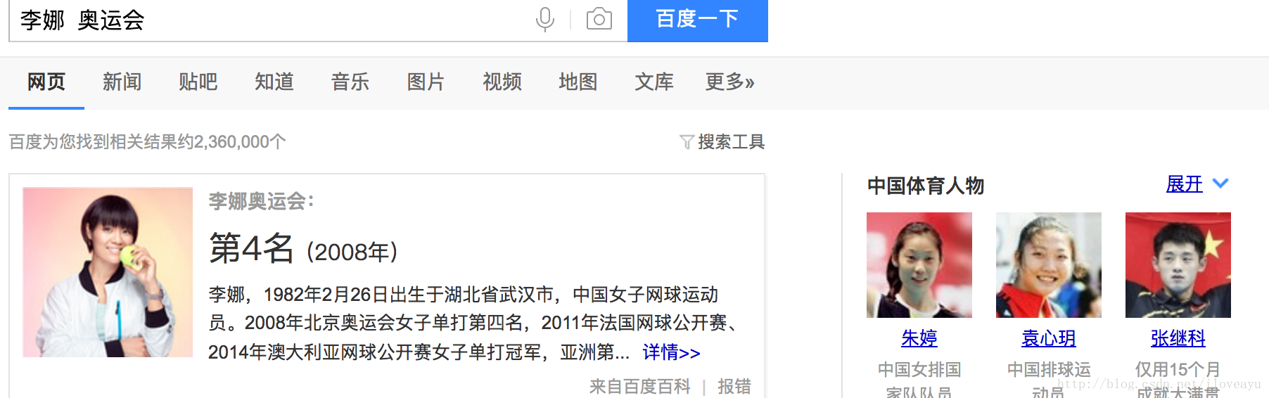 - 搜索李娜和奥运会,出现了李娜的奥运会名次,还有侧边栏的体育人物展现逻辑