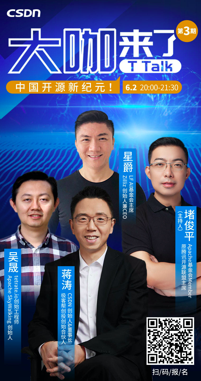 6月3日20:00,CSDN 创始人&董事长、极客帮创投创始合伙人蒋涛携手全球顶级开源基金会主席、董事,聚焦中国开源现状,直面开发者在开源技术、商业上的难题,你绝不可错过的开源巅峰对谈!立即免费围观: