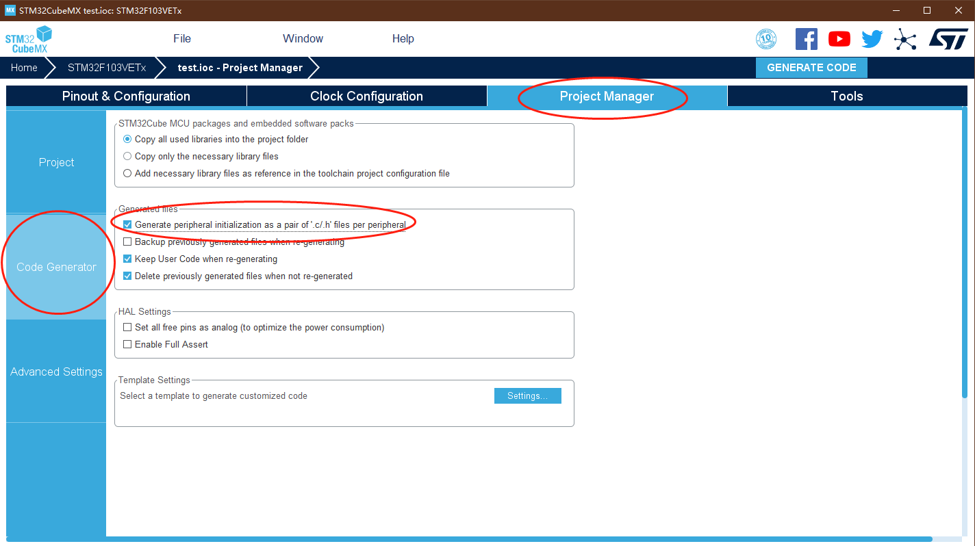 勾选:初始化代码生成在对应的外设文件。 如 GPIO 初始化代码生成在 gpio.c 中。