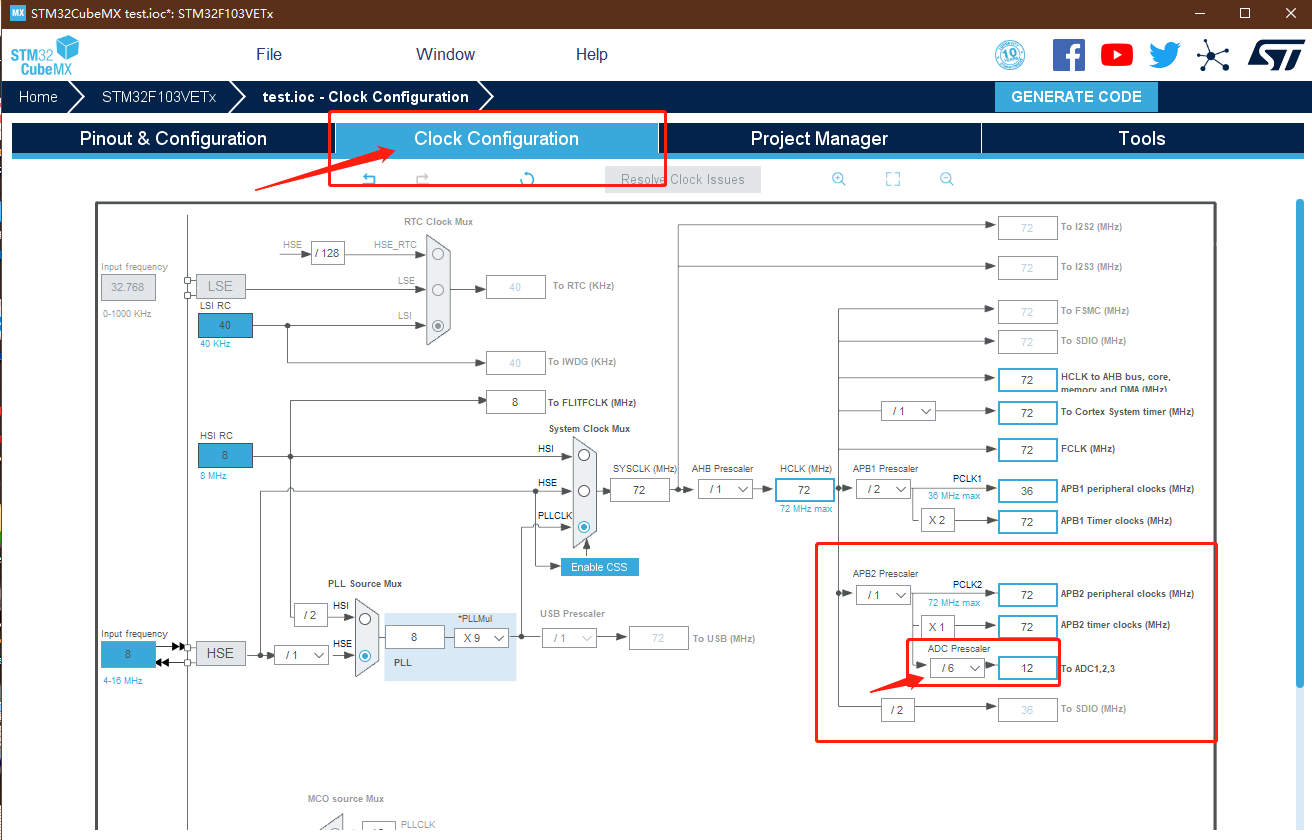 选择 Clock Configuration,配置系统时钟 SYSCLK 为 72MHz