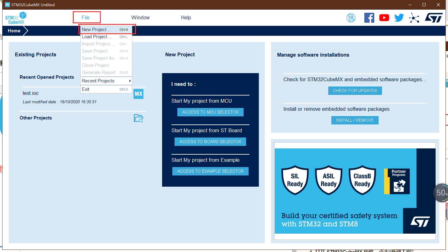 1. 打开 STM32CubeMX 软件,点击“新建工程”