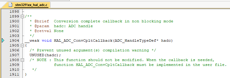 打开 stm32f1xx_hal_adc.c 文件,找到 ADC 中断处理函数原型 HAL_ADC_IRQHandler(),其主要作用就是判断是哪个 ADC 产生中断,清除中断标识位,然后调用中断回调函数 HAL_ADC_ConvCpltCallback()。