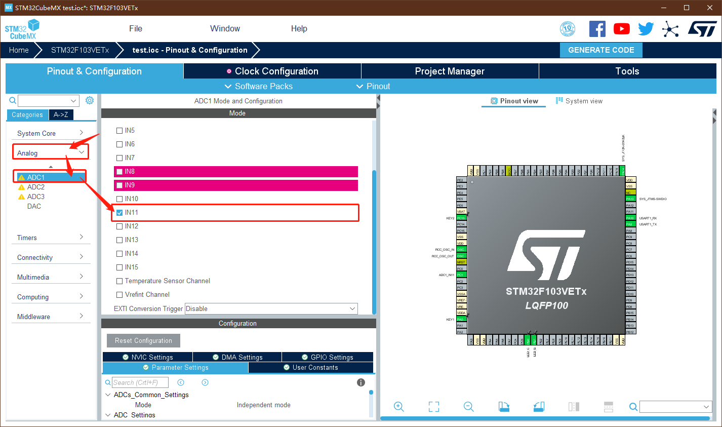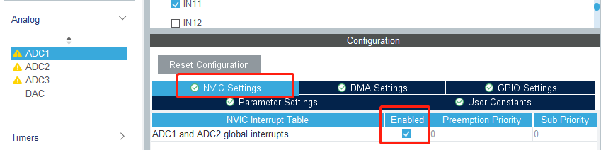 在 Analog 中选择 ADC1 设置,并选择 IN11 通道11