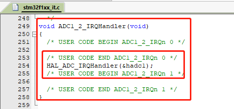 打开 stm32f1xx_it.c 中断服务函数文件,找到 ADC1 中断的服务函数 ADC1_2_IRQHandler()