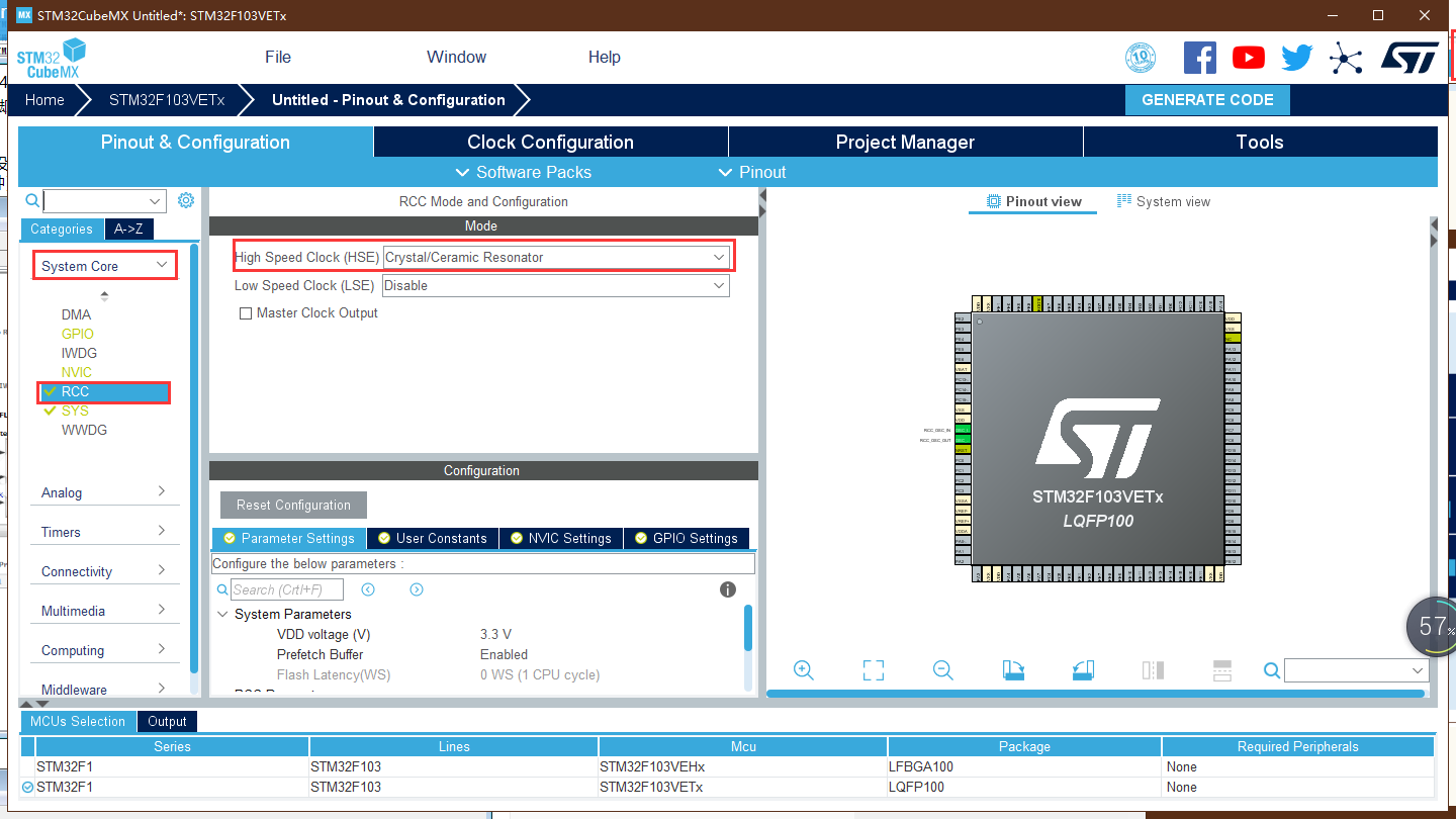 RCC 设置,选择 HSE(外部高速时钟) 为 Crystal/Ceramic Resonator(晶振/陶瓷谐振器)