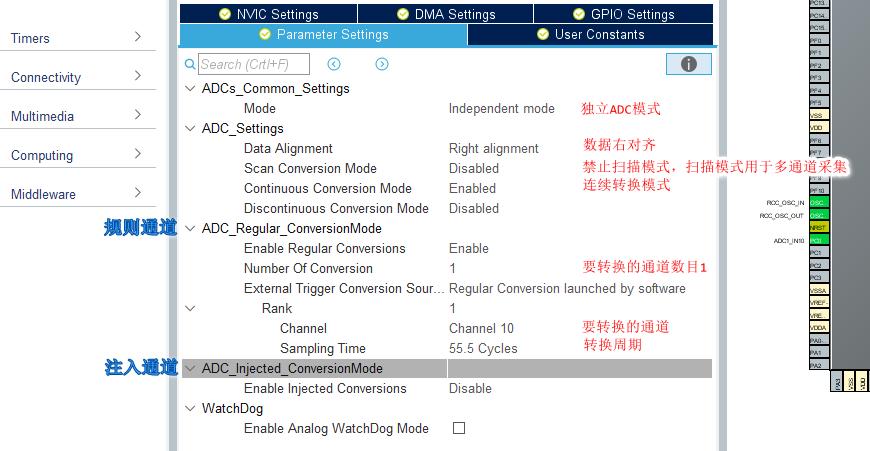 Enable Injected Conversions是否使能注入转换。注入通道只有在规则通道存在时才会出现。 - WatchDog: