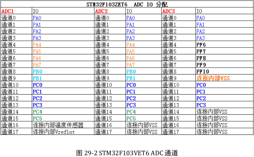 STM32 的 ADC 多达 18 个通道,其中外部的 16 个通道就是框图中的 ADCx_IN0、ADCx_IN1…ADCx_IN5。这 16 个通道对应着不同的 IO 口,具体是哪一个 IO 口可以从手册查询到。其中 ADC1/2/3 还有内部通道:ADC1 的通道 16 连接到了芯片内部的温度传感器,Vrefint 连接到了通道 17。ADC2 的模拟通道 16 和 17 连接到了内部的 VSS。ADC3 的模拟通道 9、14、15、16 和 17 连接到了内部的 VSS。
