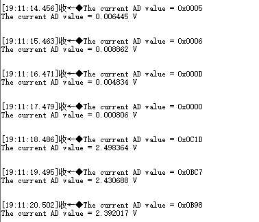 在中断回调函数中进行读取数据,将数据存放在变量 ADC_ConvertedValue 中。
