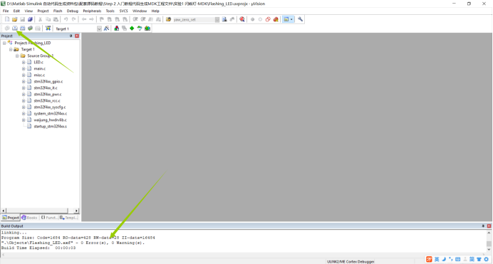 我们可以看到,点击编译后,".ObjectsFlashing_LED.axf" - 0 Error(s), 0 Warning(s).,说明工程完全没有问题,接下来我们烧写到我们的板子当中去,看看运行起来是否正确。由于我们提供的STlink下载器,所以我们首先配置一下下载器
