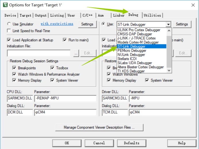 点击Debug按键,选中STlink下载器