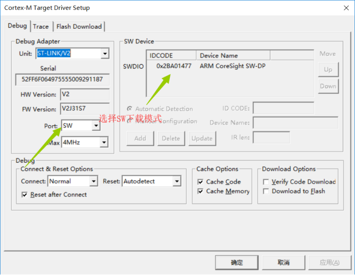 选择SW下载模式,SWDIO检测出来,说明软件已经检测到了芯片,然后点击确定