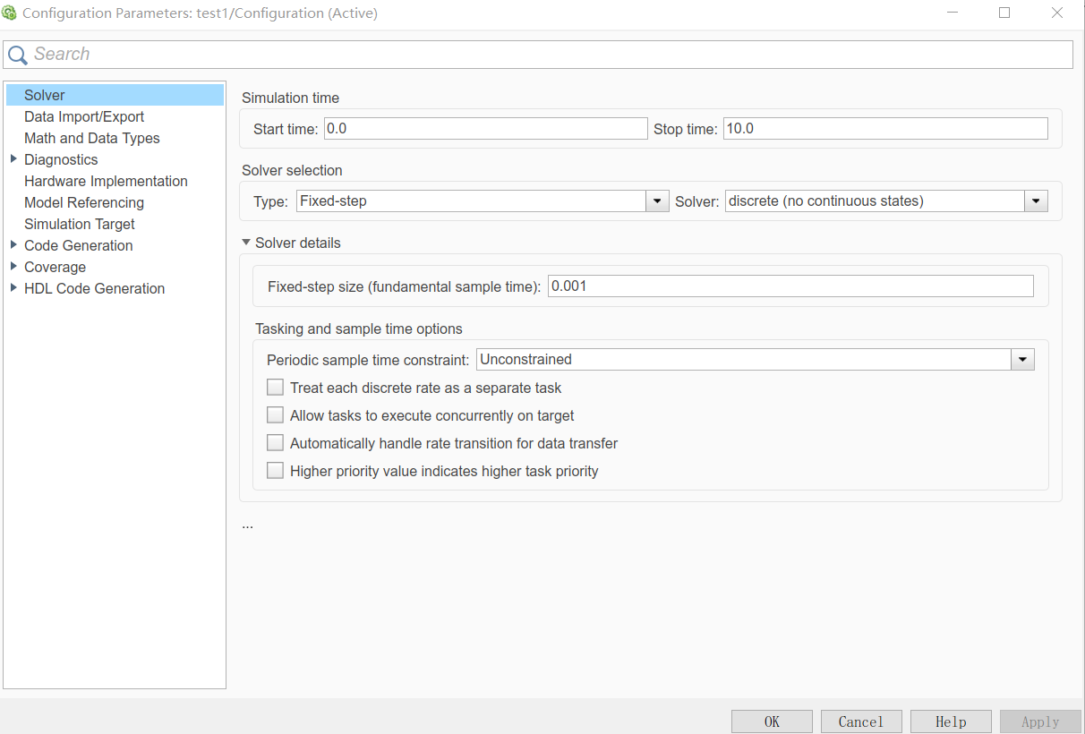 最近在调试STM32结合simulink生成嵌入式代码的强大功能,起初发现uart模块有bug,就是USART_receive直接连接USART_send会一直发送,经过几天的摸索,发现是对simulink生成的代码的原理理解错了,并不是官方的UART代码框图模块有问题。simulink生成的嵌入式代码直接类比PLC的扫描周期就很好理解了,每个扫描周期就是simulink里面的采样周期,也就是下面设置的fixed-step size,这个设置会生成代码在每1ms执行一次