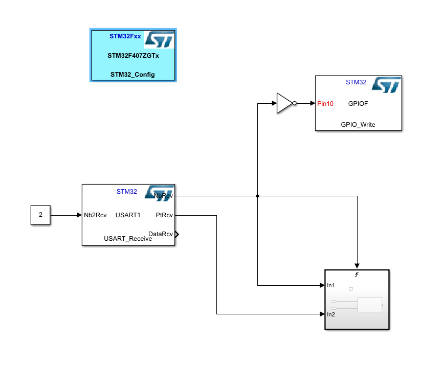 另外,每串口接收完两个字符后执行一遍程序后,他会在下个扫描周期重新初始化Nbrcv,PtRcv,DataRcv,这些存储空间不是一直保留上一次收到的结果,而是每次接收完一次,再下个扫描周期会从新初始成null,这点及其重要,这是基于simulink扫描周期执行的性质,也就是说uart模块只能接收定长字节的数据,不能接收变长的数据,只能按设置Nb2Rcv接收数量接收满后立即执行后面的信号线中的代码,无法实现变长数据的接收和处理,这种灵活性还是不够,比如要实现modbus不定长数据帧就不能完全满足要求了。目前 stm32-mat-target 在ST官网上是废弃状态,官网已经下架了,但是stm32-mat-target的模块化编程对于快速生成代码时及其方便的。