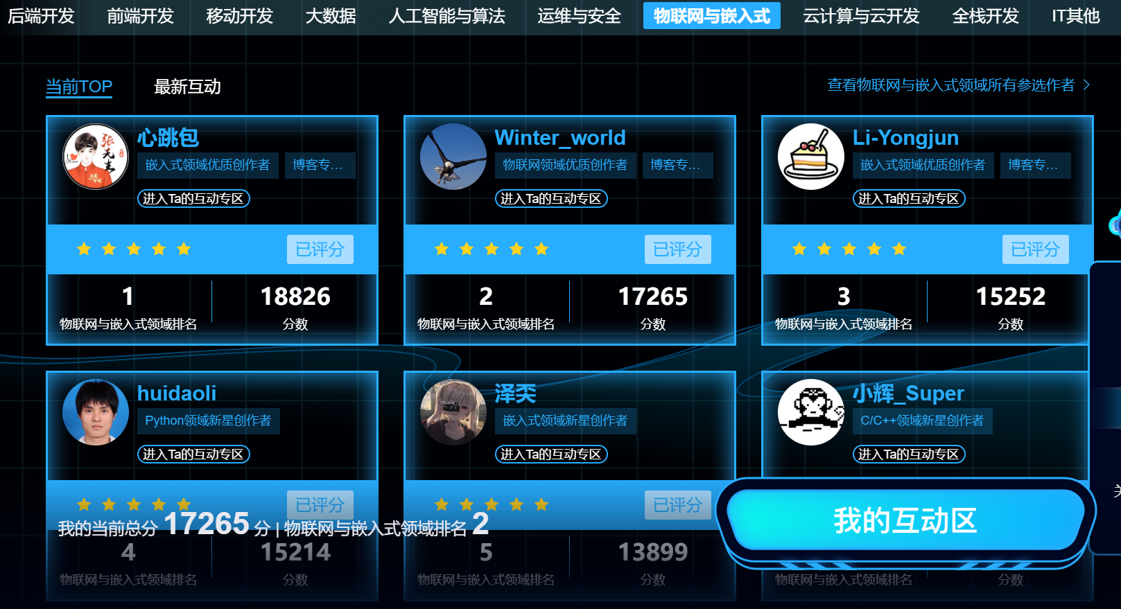 今年很荣幸进入了博客之星TOP50,应该是第27名(按官方给的名单,虽然注明排名不分先后,但是眼尖的早已排过名次了:)),今年与以往不同的是划分了领域,我一直是物联网与嵌入式领域的,很庆幸今年入围了物联网与嵌入式领域第二名。
