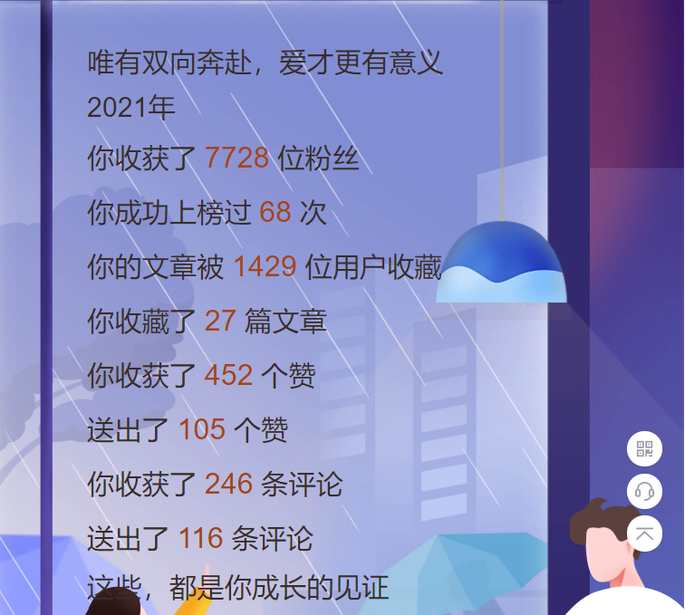 时间过的很快,已在CSDN混迹10余年,从上学时查查资料,翻翻帖子,寻觅解决方案,到现在自己写技术文章,参加博客之星大赛。照旧记录下今年在CSDN的情况吧,这篇文章就不那么啰嗦了,仅以此短文记录我在CSDN的2021。