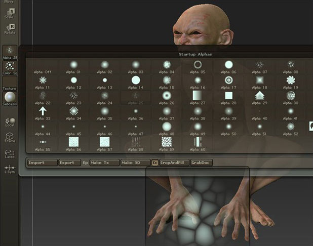 然后将这个头部网格输入到ZBrush 3.1,开始做雕刻。首先,我用移动工具扭曲了网格,然后用普通笔刷做雕刻。最后,用不同的阿尔法做细节,包括软件中的阿尔法和我自己在网站上找到的阿尔法。很快,我就做好了头部的第一个版本。